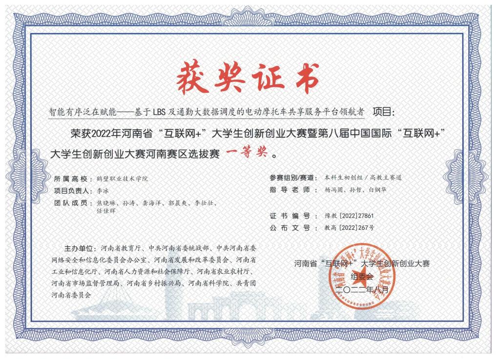 智能有序泛在赋能----基于LBS及通勤大数据调度的电动摩托车共享服务平台领航者项目荣获2022年河南省“互联网+”老员工创新创业大赛暨第八届中国国际“互联网+”老员工创新创业大赛河南赛区选拔赛一等奖。